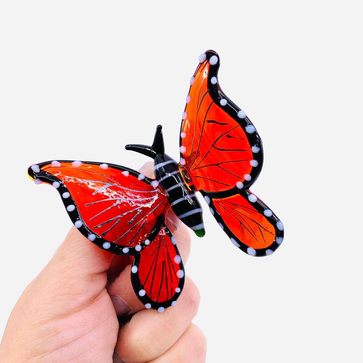 This handmade glass butterfly captures the beautiful and miniscule details of the iconic North American butterfly. A lampwork technique is used to melt down tiny sections of glass rods to create each whimsical design.