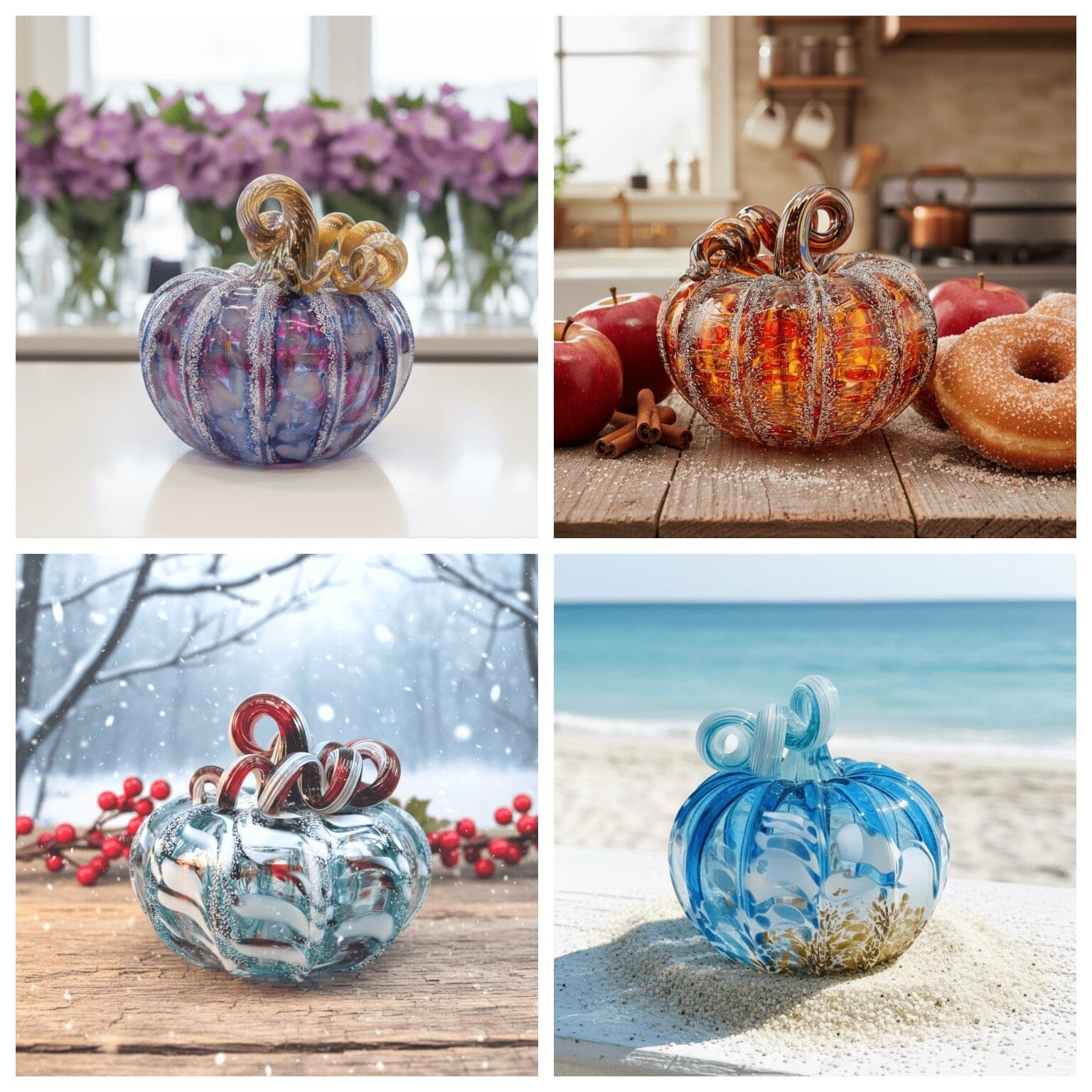Each piece captures the essence of its season—from autumn's warm harvest vibes to winter's cozy charm, spring's fresh awakening, and summer's vibrant energy. These handcrafted glass pumpkins showcase the artistry and attention to detail that made them bestsellers year after year. Perfect for year-round décor, gifting, or completing your collection, this 4-piece set brings a playful pop of color and seasonal spirit to any space. A must-have for pumpkin lovers and glass art enthusiasts alike.