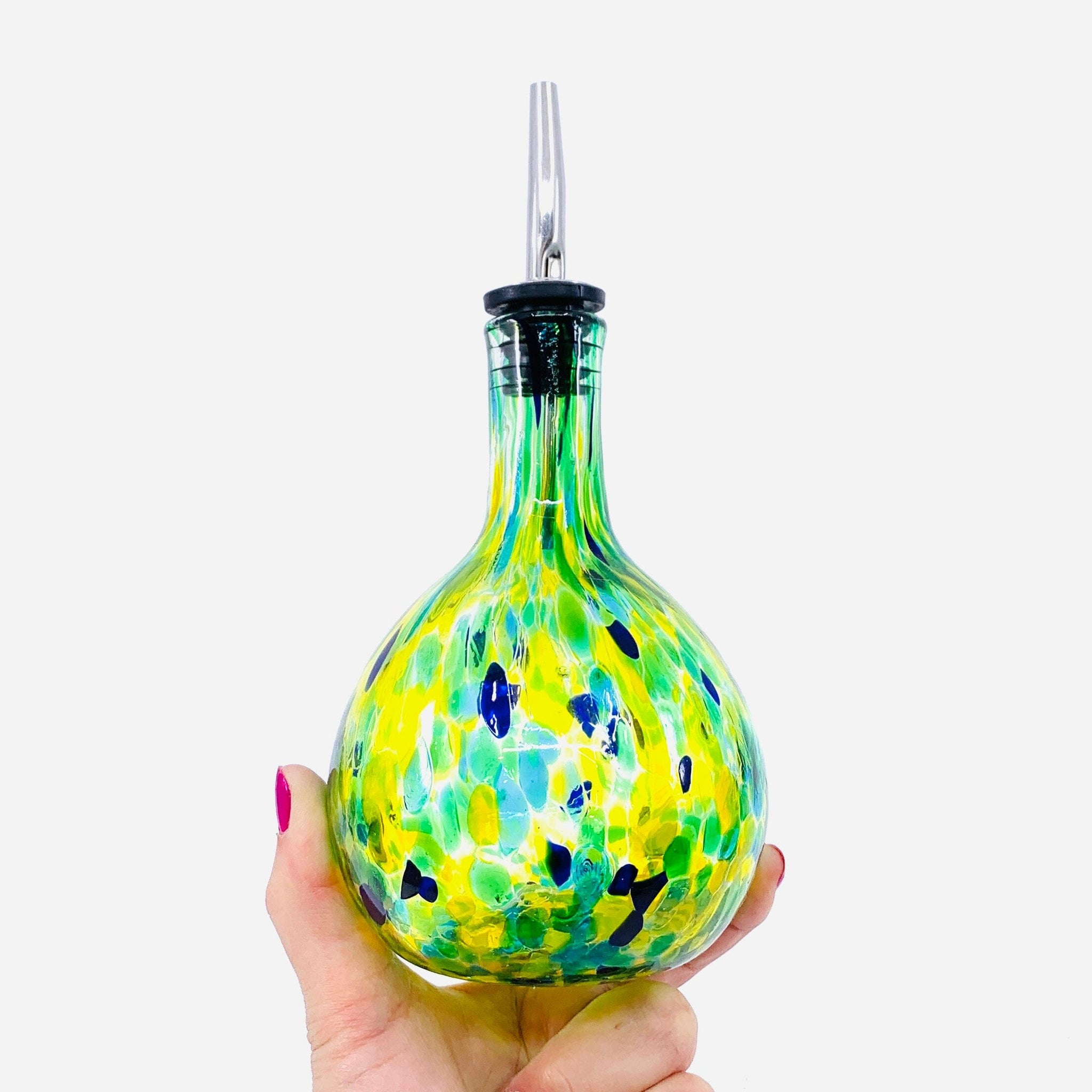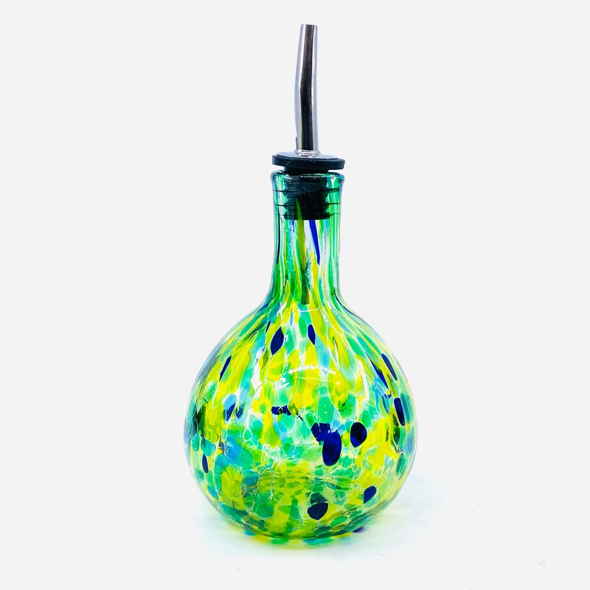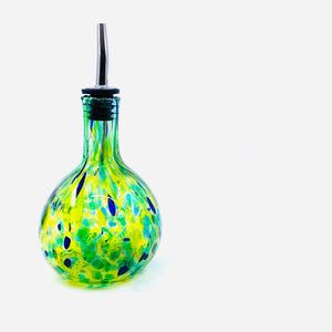 This hand-blown glass cruet features a stunning pattern and each one is unique. A beautiful decorative piece and a wonderful way to pour oil, vinegar etc.... to impress your guests during your next gathering.