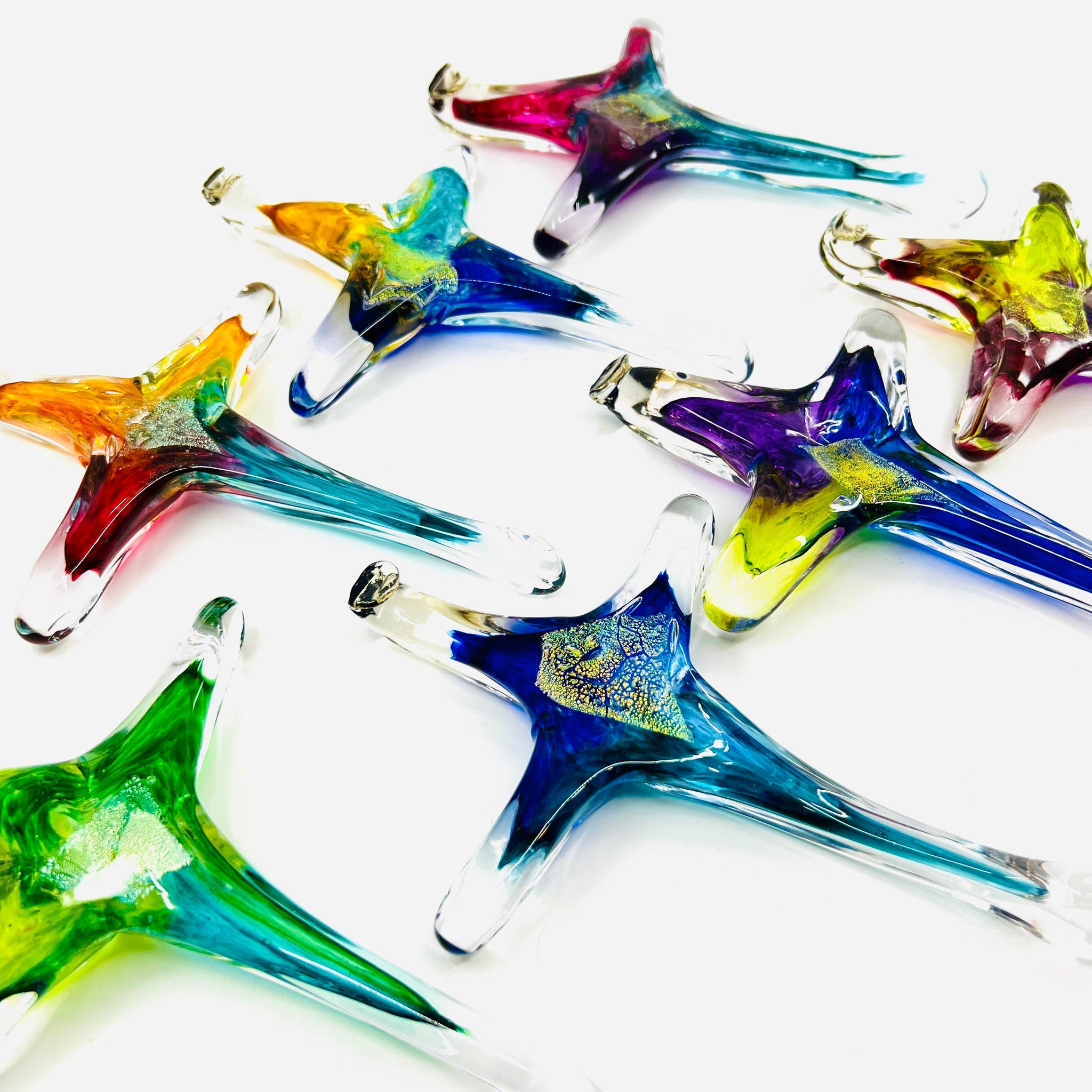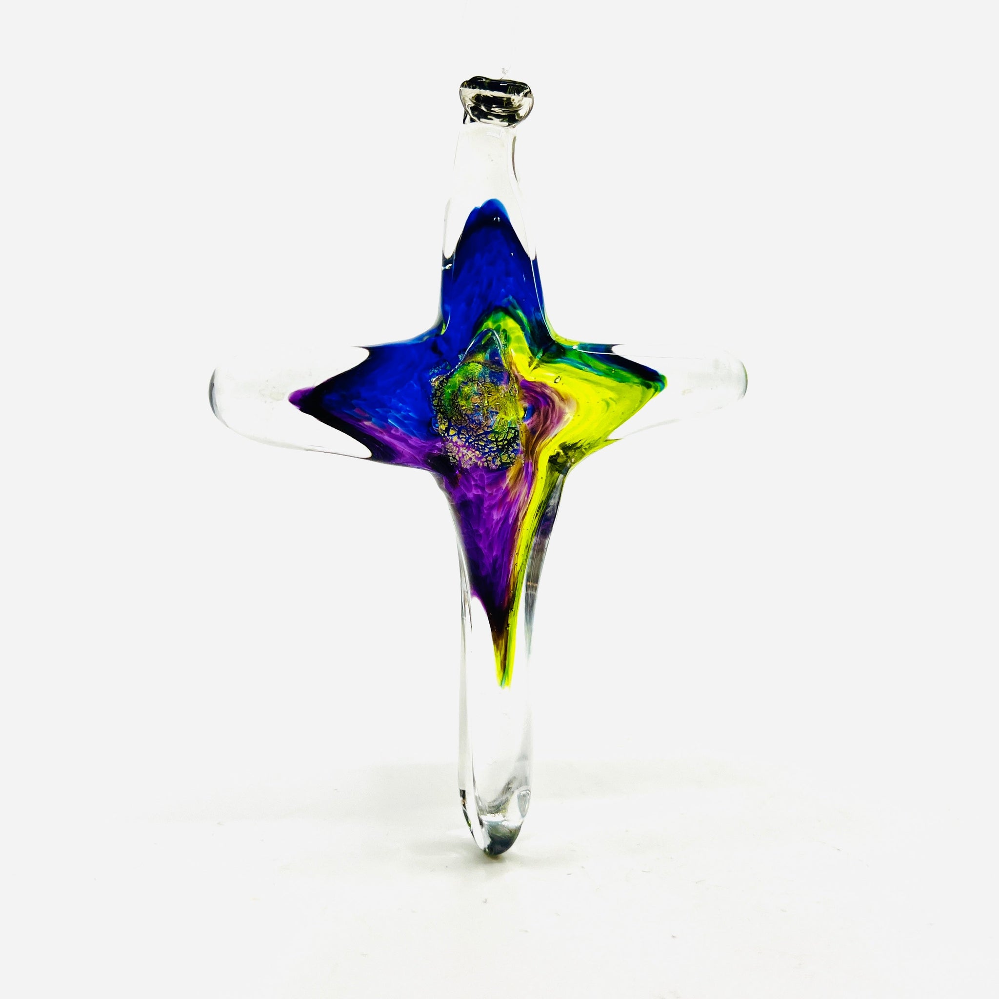 Cross Ornaments make your window a cathedral window. Handmade glass Crosses come in a variety of tri-color combinations, each with a sparkly dichroic center. Each cross is made with a glass loop at the top, making them easy to hang in a window with ribbon, twine or fishing line. They look great sitting on a desk as a paperweight, or out in the garden. Use them in alters, or create sacred and special areas of your home. Give the gift of handmade. The possibilities are endless.