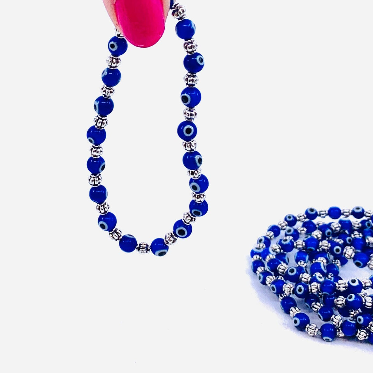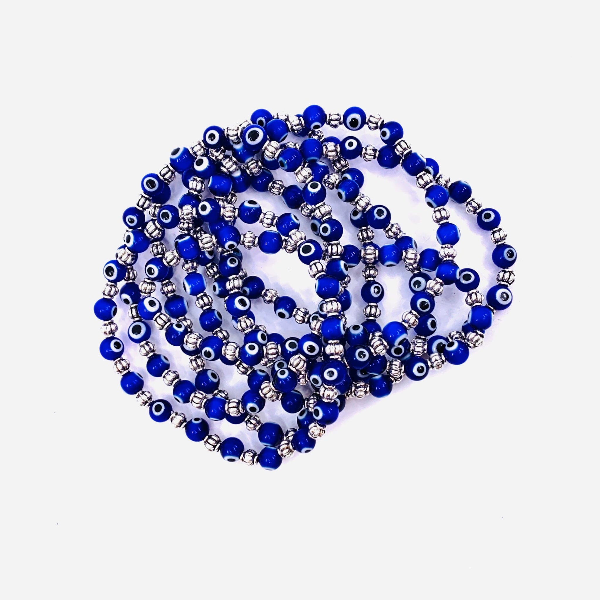Each bracelet contains a glass evil eyes which are supposed to  protect you from and ward off the evil that has been directed at them. Adding and jewelry to an outfit with the evil eye symbols on it provides the home with both power and protection against evil spirits or bad luck. Each bracelet is made up of a collection of iconic blue glass evil eye beads and metal engraved beads.
