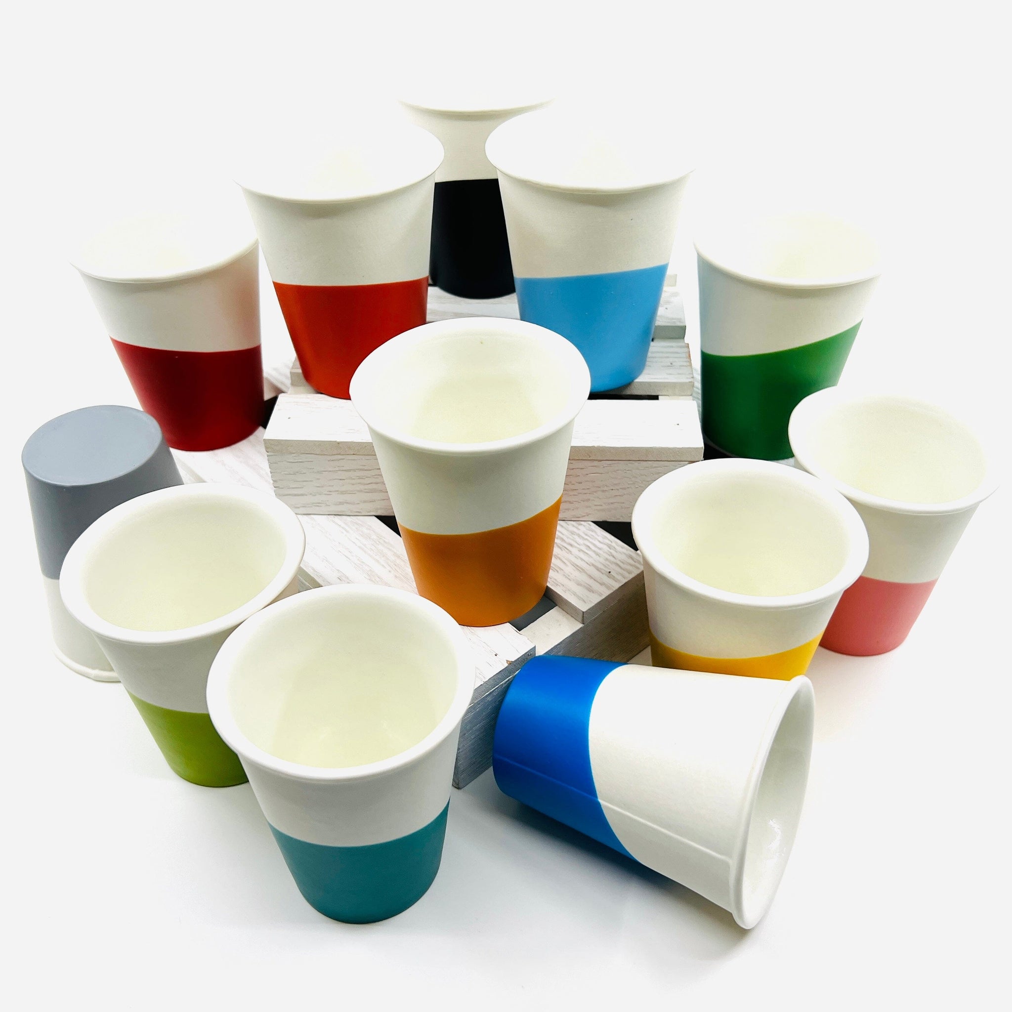 Your morning espresso has never been so fun. These sturdy, handcrafted cast porcelain dixie cups are perfectly recreated, even right down to the seam. Featuring colorful, rubber-dipped bottoms for a no slip grip. This is the cup you never have to throw away. Choose your favorite colors and stock your cupboard.