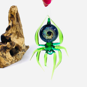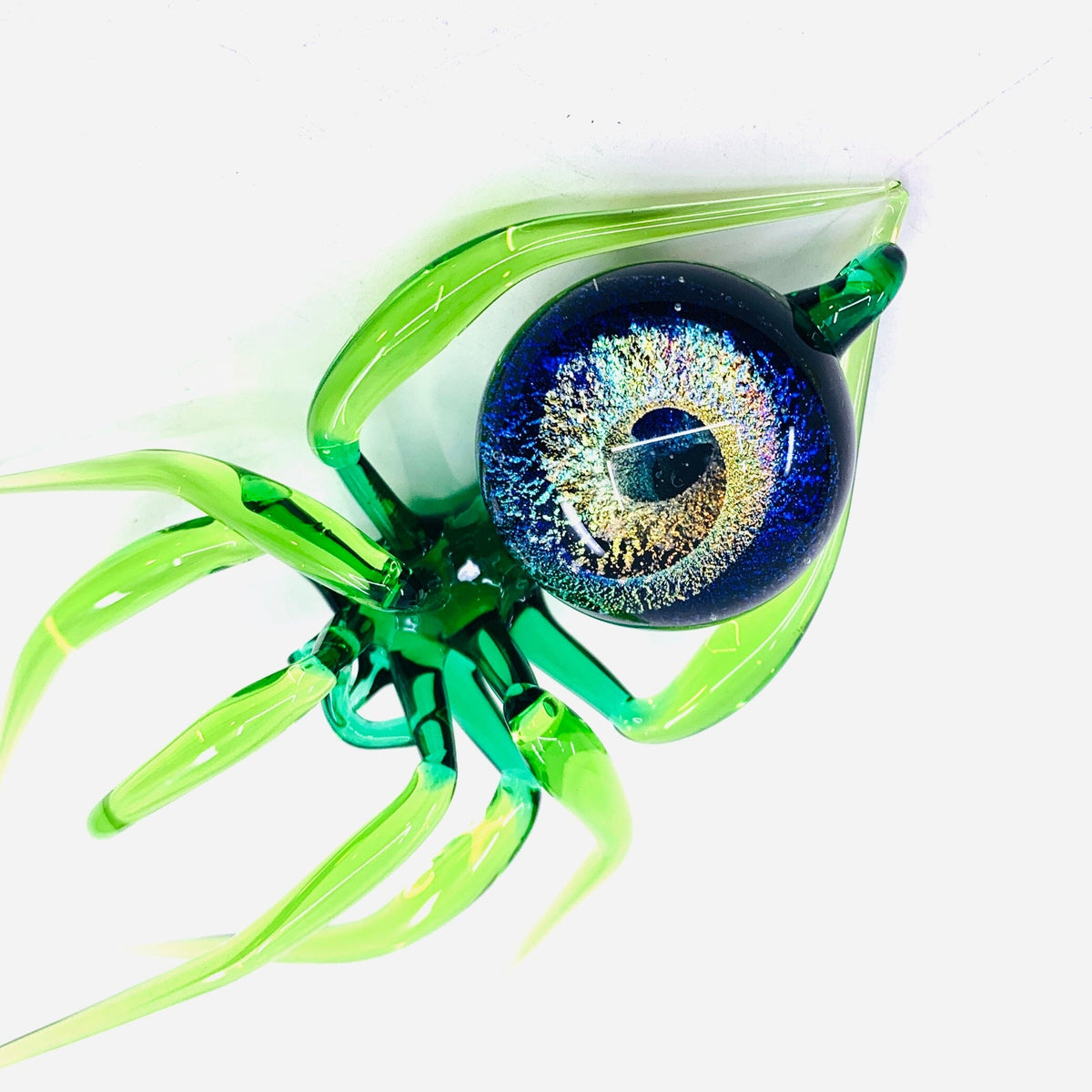 This exquisite hand-blown glass spider boasts a show-stopping dichroic belly. Easily hung as an ornament, it can also be appreciated for its intricate craftsmanship. Each one is one-of-a-kind, available in several different  unique color variants.
