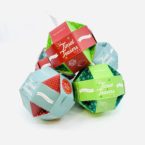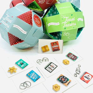 A modern twist on Christmas Crackers. Each ornament shaped gift boxincludes a surprise card game and wood or metal puzzle. It's a fantastic and entertaining way to include the whole family decorating the tree at holiday time.
