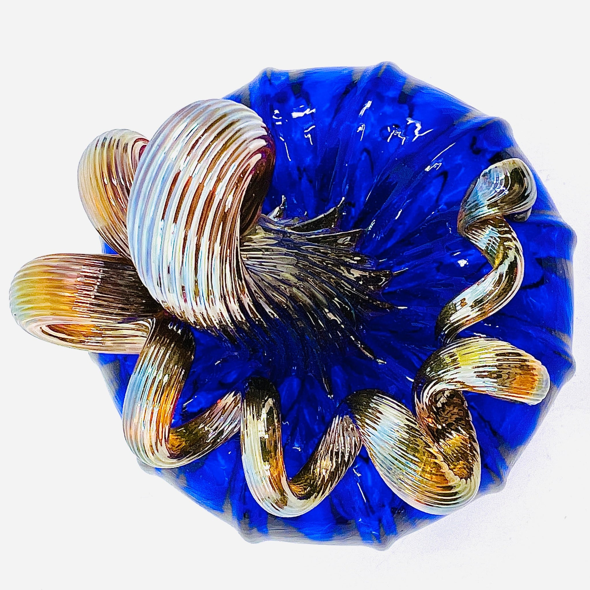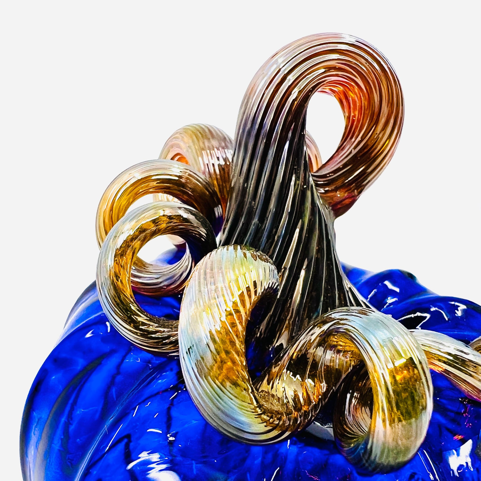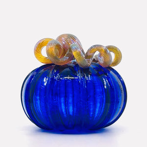These magical, handmade glass pumpkins make a statement all year round with their rich colors, fine details, and playfully coiled gold stems. Handblown at the Luke Adams Glassblowing Studio in Norwood, MA studio. Pure magic.