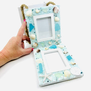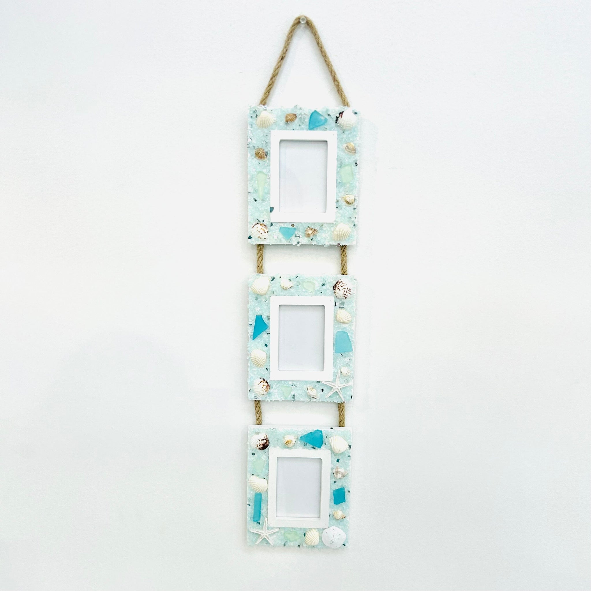 Enchant your home or office with this charming seaglass triple picture frame. It captures the unique serenity of the ocean with its coastal vibes, adding an inviting touch of beachy ambiance to any room. Its also a perfect gift for any beach lover!