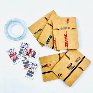 Includes 5 collapsed boxes, 5 adhesive shipping labels, and tiny packing tape.