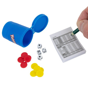 Includes 1 Cup, 5 Dice, 10 Chips, 2 Pencils, and Score Cards. Shake, roll, and score your way to victory with this ultimate mini version of the timeless game!